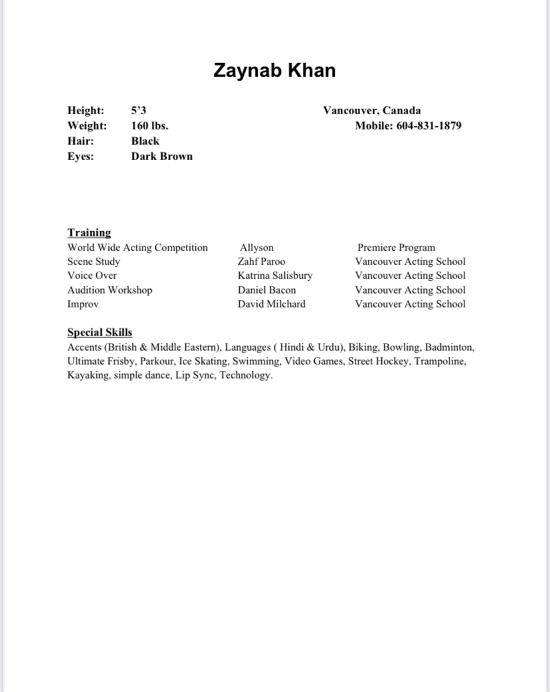 Accents (British & Middle Eastern), Languages ( Hindi & Urdu), Biking, Bowling, Badminton, Ultimate Frisby, Parkour, Ice Skating, Swimming, Street Fighting, Rock Climbing, Video Games, Street Hockey, Trampoline, Kayaking, simple dance, Lip Sync, Technology